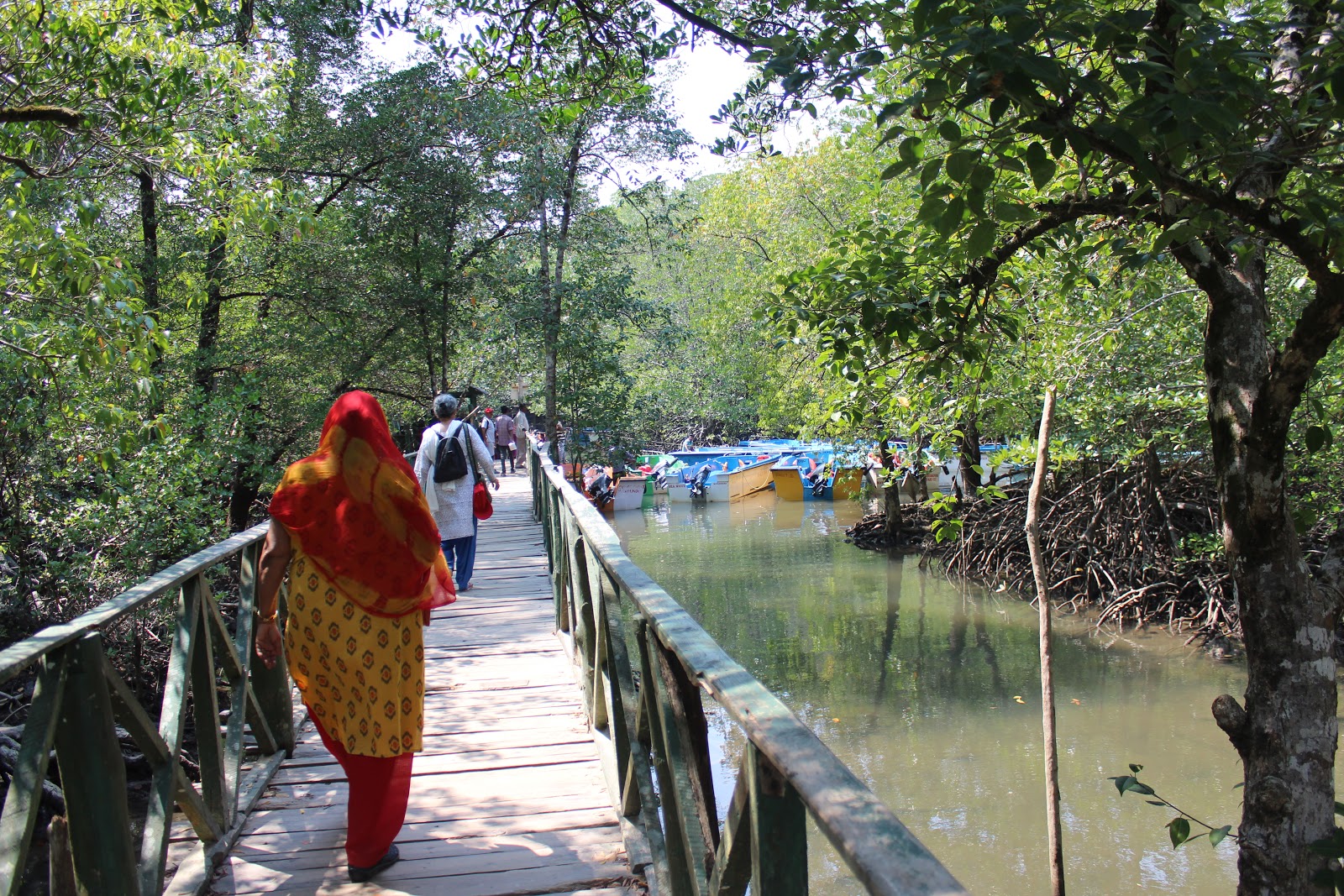 ಕಾಂಡ್ಲಾ ಅರಣ್ಯದಂಚಿನಲ್ಲಿ ನೀರಲ್ಲಿ ಬೇರಿಳಿಬಿಟ್ಟು ಬೆಳೆದ ಕಾಂಡ್ಲಾ ಮರಗಳ ಬಳಿ ದೋಣಿ ಸಾಗಿತು.